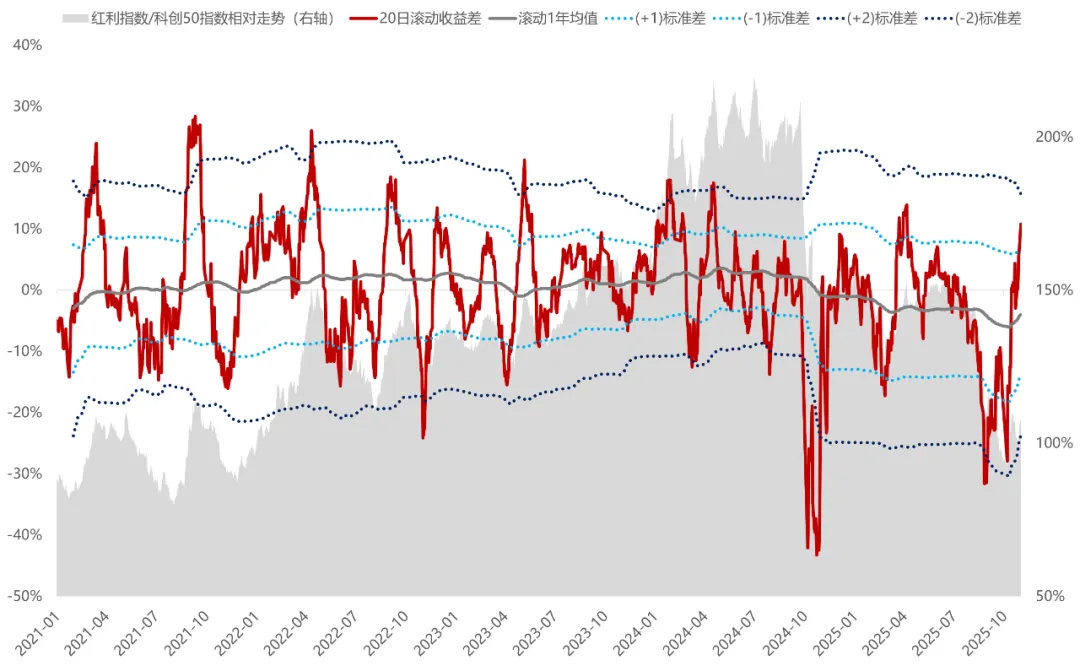 从投资体感来看,风险偏好的收缩与扩张通常对应市场上的风格轮动。如果我们以红利指数为风险偏好收缩指征,以科创50指数为风险偏好扩张指征,通过两者的收益差或可简易观测A股市场上的风格轮动。