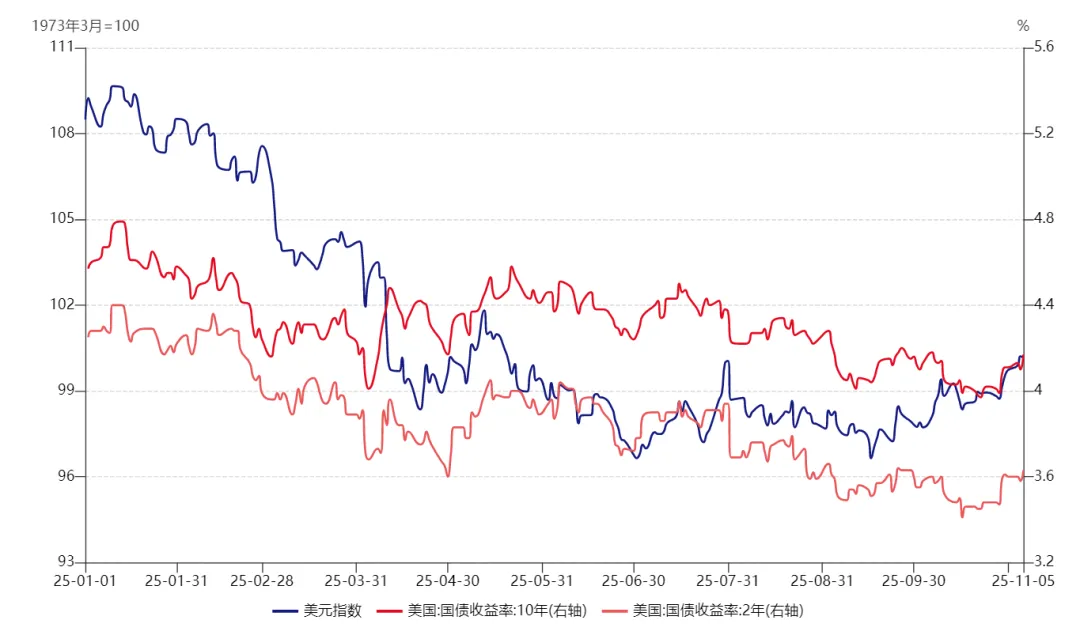 所以,今年9月之前美元指数的走弱看似是特朗普政府引发的,但更重要的原因是前期维系强美元的基本面、政策面和资金面根基或都已发生动摇。从数据上来看,美国经济虽然不弱,但面对贸易战中大显韧性的中国经济和提出巨额财政扩张计划的欧洲,相对优势在削弱。尤其在科技领域,中美差距持续缩小,这种相对优势的打破一度影响了全球资本的流动,体现为对美元资产的偏好下降和区域再平衡。而对于美国的政策制定者来说,维系强美元的成本越来越高,不得不开始主动寻求美元贬值缓解压力,这一点从特朗普几次三番催促美联储降息就可见一斑。(资料来源:WIND,20251106)