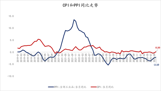 10月份,扩内需等政策措施持续显效,叠加国庆、中秋长假带动,CPI环比上涨0.2%(前值+0.1%),同比由下跌0.3%转为上涨0.2%,核心CPI同比上涨1.2%(前值+1.0%),涨幅连续第6个月扩大。受国内部分行业供需关系改善、国际大宗商品价格传导等因素影响,PPI环比由上月持平转为上涨0.1%,为年内首次上涨;同比下降2.1%,降幅比上月收窄0.2个百分点,连续第3个月收窄。