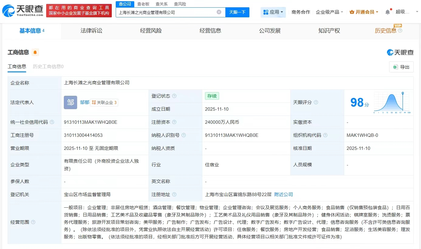 雷达财经讯,天眼查App显示,11月10日,上海长滩之光商业管理有限公司成立,法定代表人为邹郁,注册资本24亿人民币,经营范围包括企业管理、非居住房地产租赁、酒店管理、餐饮管理、旅游开发项目策划咨询等。股东信息显示,该公司由上港集团(600018)全资持股。