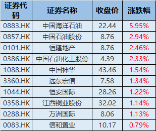 标普港股通低波红利指数前十大成分股今日表现