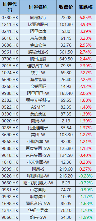 恒生科技指数成分股今日表现