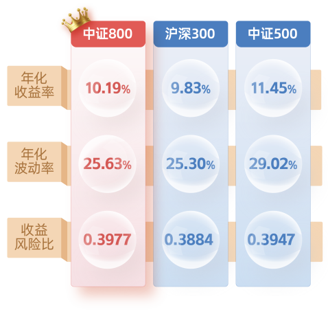 从指数历史业绩走势来看,中证800指数自2004.12.31至2025.09.19,年化收益率高于沪深300,年化波动率小于中证500,收益风险比较高。