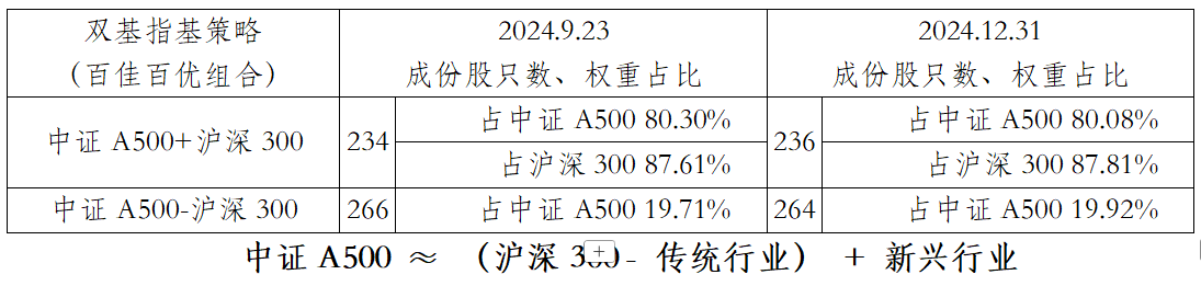 另一方面,中证A500指数成份股数量较多,大量成份股权重相对较低,不利于完善“选好股、能重仓、拿得住”投资逻辑闭环。鉴此,2024年10月,长盛基金公司杨衡博士基于中证A500指数数学底核,开创性设计提出“双基指基”指数化策略,并经公司产品委员会多次充分论证,投资逻辑自洽,经济含义深刻,具有丰富的应用场景开拓空间。