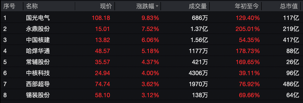 个股方面,国光电气一度涨超11%,永鼎股份涨超7%,中国核建、哈焊华通、常辅股份等个股跟涨。