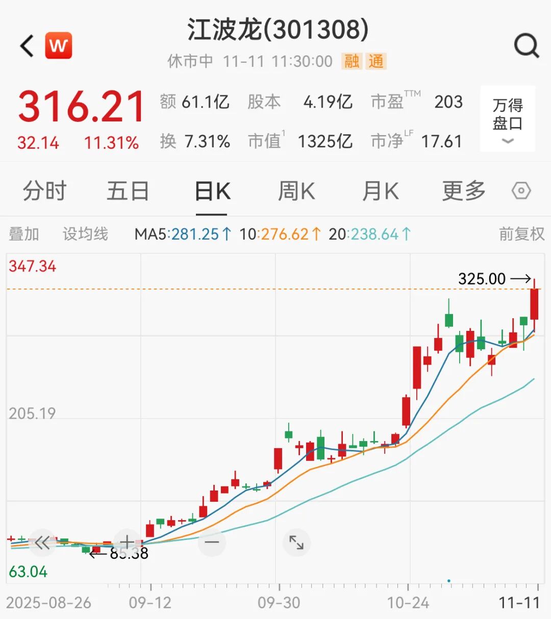 江波龙大涨11.31%,现报316.21元/股,股价再创历史新高。