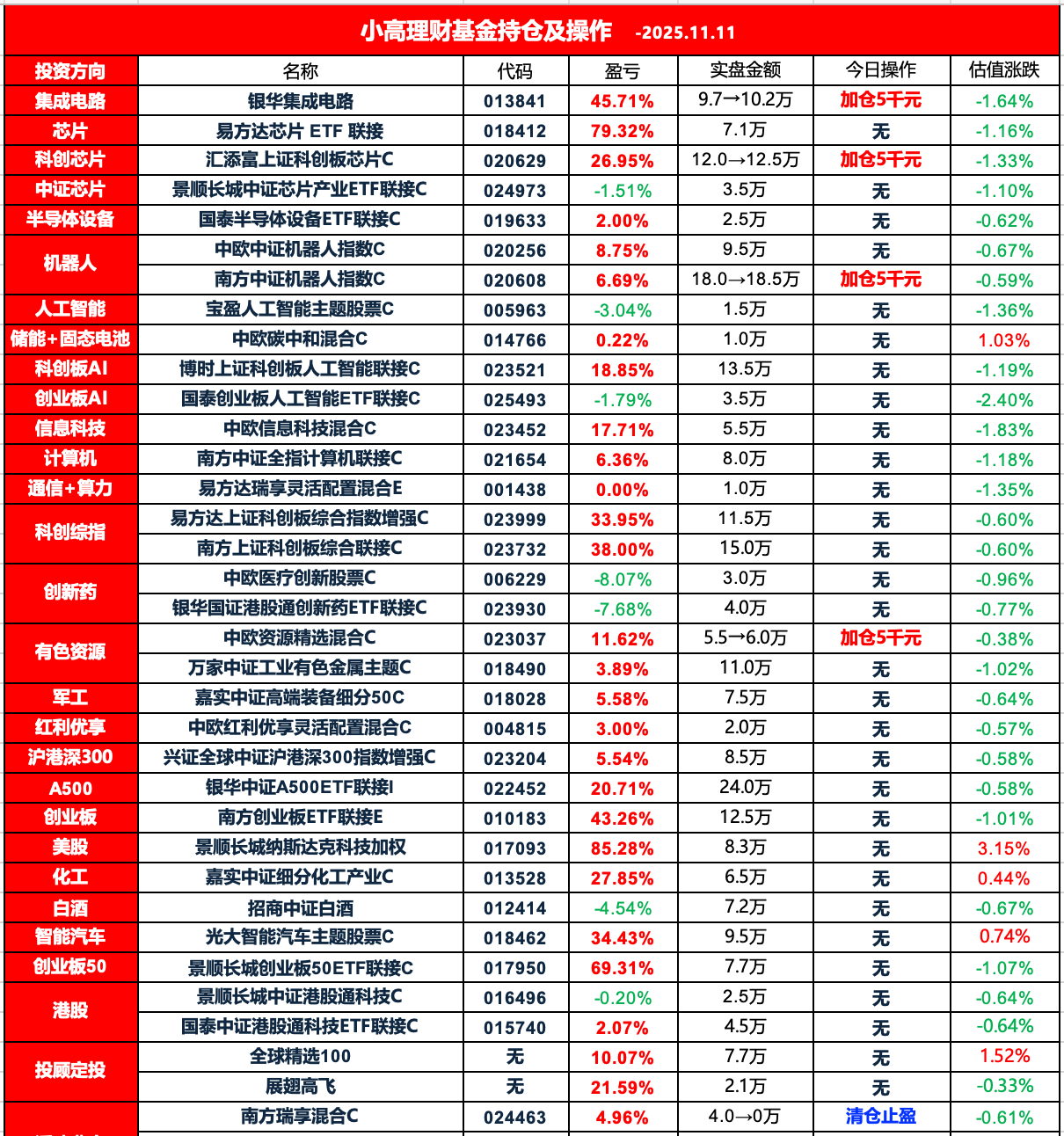行情观点:A股今天整体呈现出高开低走的弱势震荡行情。上证指数在4000点上下展开激烈拉锯,三大指数呈现震荡分化格局。建材、黄金、电力等低估值板块受到资金青睐,煤炭、5G通信、人工智能等板块则受到资金打压。小高今天有买有卖,加仓$汇添富上证科创板芯片ETF联接C$、$银华集成电路混合C$、$中欧资源精选混合C$和$南方中证机器人ETF联接C$,止盈手里的一只混合基金。A股4000点拉锯战,小高稳住心态,踏准节奏,稳步前行!无论多忙小高都会坚持免费分享自己的基金操作策略,希望大家都能点赞、点关注支持下小高,你们的支持真的就是小高坚持每天免费分享的最大动力!