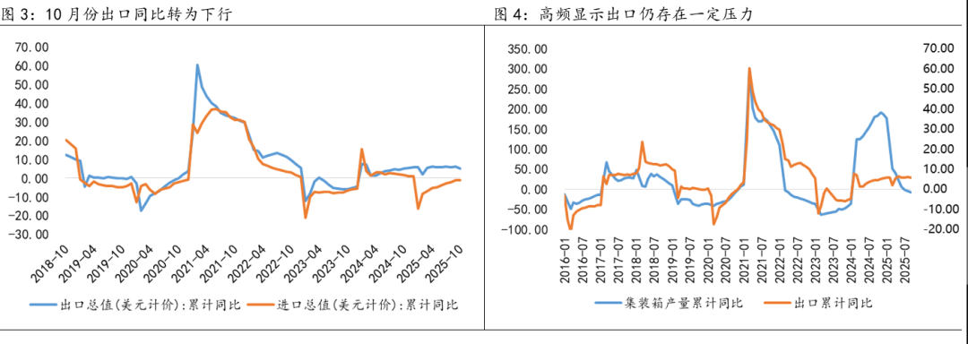 出口增速下滑受到工作日错位和同期高基数的影响,今年10月份工作日减少1天,且2024年当月外需在“抢出口”效应影响下,同比超过12%。结构上看,10月份对美出口同比-25.2%,对欧洲出口同比下滑至0.9%,是当月外需的较大拖累项。商品方面结构性分化较明显,10月份对机电、汽车和船舶维持两位数同比高增,但劳动密集型偏弱。年内来看,集装箱产量等高频指标反映出口端仍存压力。