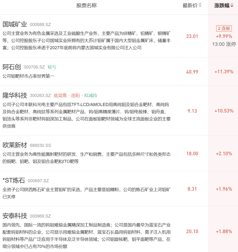 受供需影响,今年钼产业链价格持续上涨。公司中,国城矿业公告拟31.68亿元收购国城实业60%股权,标的主营钼精矿采选,近期连续涨停。