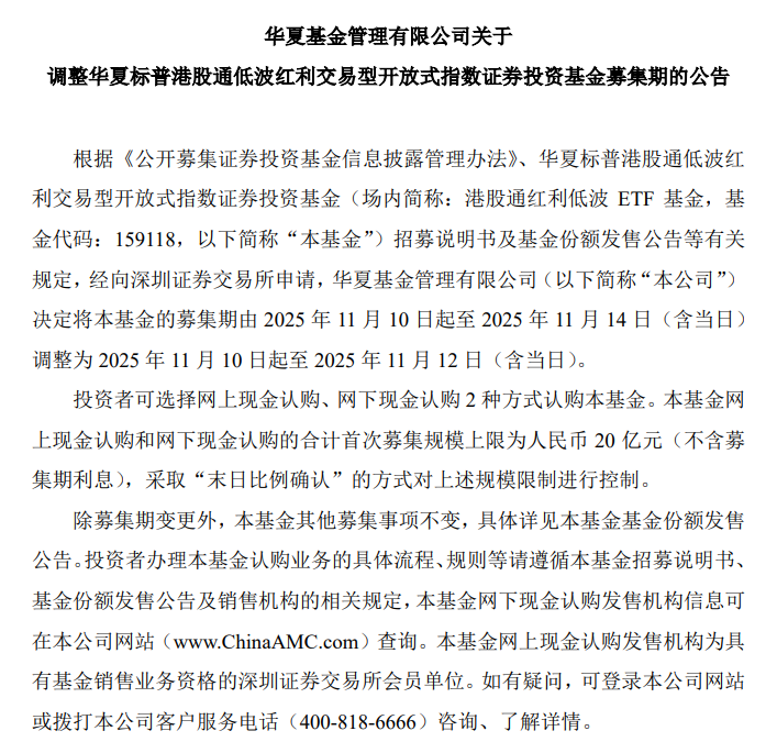根据最新公告显示,华夏标普港股通低波红利交易型开放式指数证券投资基金(场内简称:港股通红利低波ETF基金,基金代码:159118)的募集期由2025年11月10日起至2025年11月14日(含当日)调整为2025年11月10日起至2025年11月12日(含当日)。