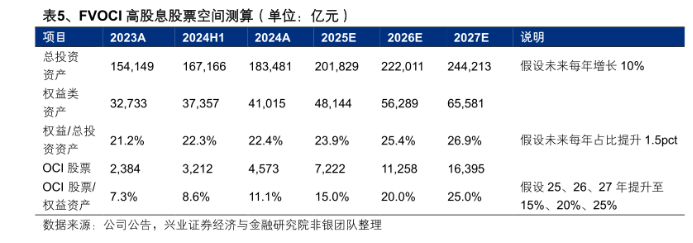 1、 岁末年初,高股息资产迎来增量资金:FVOCI-高股息资产配置规模有望继续提升。从中报数据来看,上市七家人身险和财产险公司合计 FVOCI股票占总股票比重从年初的33.8%提升至41.1%。根据兴业证券非银团队测算,参考平安 2024 年末 FVOCI股票占权益投资比重 28%左右水平,预计 2025年-2027年,5家A股上市险企 FVOCI的高股息规模将达到 7222 亿元、1.1 万亿元及 1.6 万亿元,每年新增规模 2500-5000 亿元。非上市险企自2026年1月1日起也将执行IFRS9 和 IFRS17 新准则,提升配置高股息股票的需求;此外,保险开门红新增缴费流入增加。