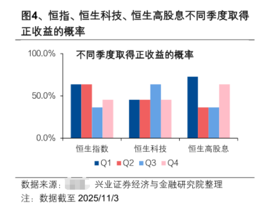 2、岁末年初,高股息资产更占优:统计 2015 年以来港股主要指数不同季度取得正收益的概率及收益平均值情况,可以发现,1)一季度、四季度港股高股息资产取得正收益的概率高,分别为72.7%和63.6%,收益平均值分别为 3.21%、3.35%,均高于二、三季度表现。2)相较于恒指、恒生科技,四季度港股高股息数取得正收益的概率更高,收益率平均值更高。