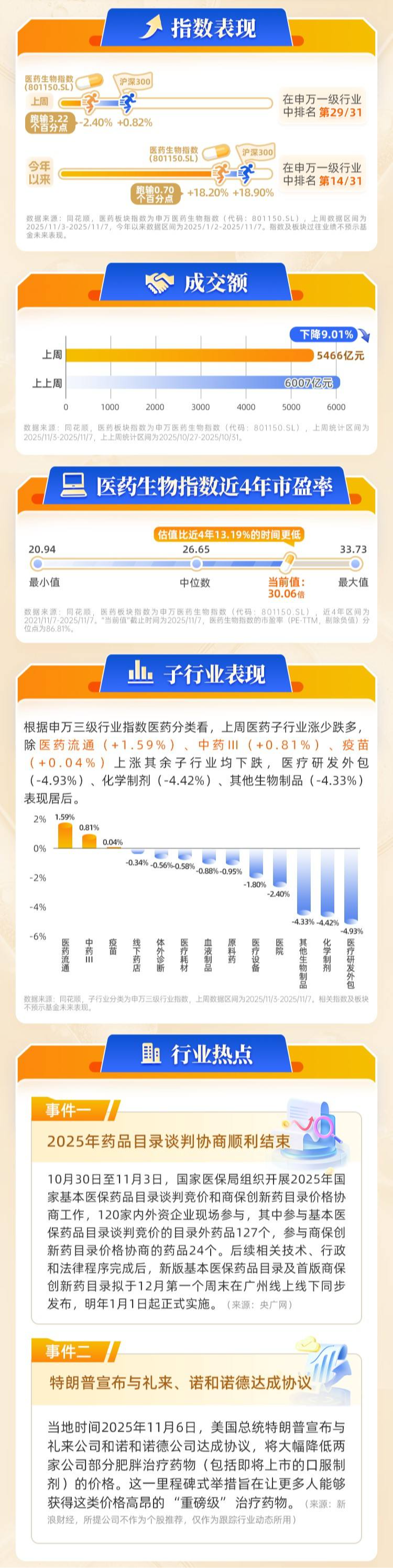 【医药表现】上周医药生物指数上涨0.82%,在申万31个一级行业指数中涨跌幅排名居第29位,成交额为5466亿元;上周医药子行业涨少跌多,医药流通(+1.59%)表现最好。(数据来源: 同花顺,医药板块指数为申万医药生物指数,代码: 801150.SL,上周数据区间为2025/11/3-2025/11/7。指数及板块过往业绩不预示基金未来表现。)