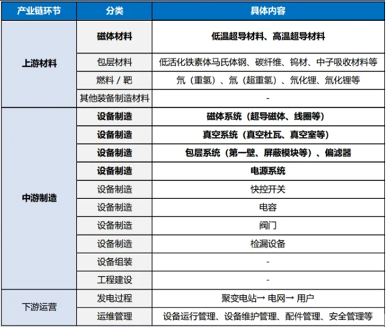上游是基础,提供了核心部件和材料,包括超导材料、氘、氚等,这些材料的性能决定了装置寿命;