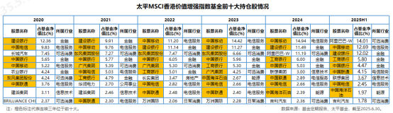 (2) 坚守价值,稳定持久。该基金跟踪的MSCI香港价值增强指数采用市净率、远期市盈 率、企业价值/运营现金流三个变量筛选低估值港股,成分股具备高分红、稳健经营 的特点。同时,MSCI香港价值增强指数的前十大权重股较为稳定,故基金绝大部分 重仓股持有时间都达到或者超过了三年。此外,太平MSCI跟踪指数的行业分布和投 资风格是相当稳定的。