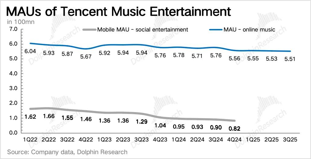 但新增订阅数的持续下降,仍然反映了现有生态到顶甚至开始流失的问题,本质上就是竞争带来。这也是财报前腾讯音乐股价持续调整的核心原因,订阅收入保持稳定增长(长期10%-15%)是远期20x PE估值的关键支撑。三季度字节动作较大,这里可以关注下电话会管理层对竞争的看法以及应对措施。