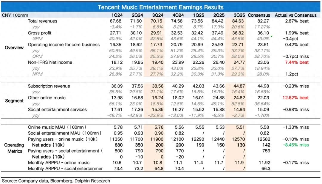 北京时间11月12日港股盘后、美股盘前,腾讯音乐(TME.N; 1698.HK)发布了2025年第三季度财报。整体看超预期,尤其是第二增长曲线的故事得以部分演绎。