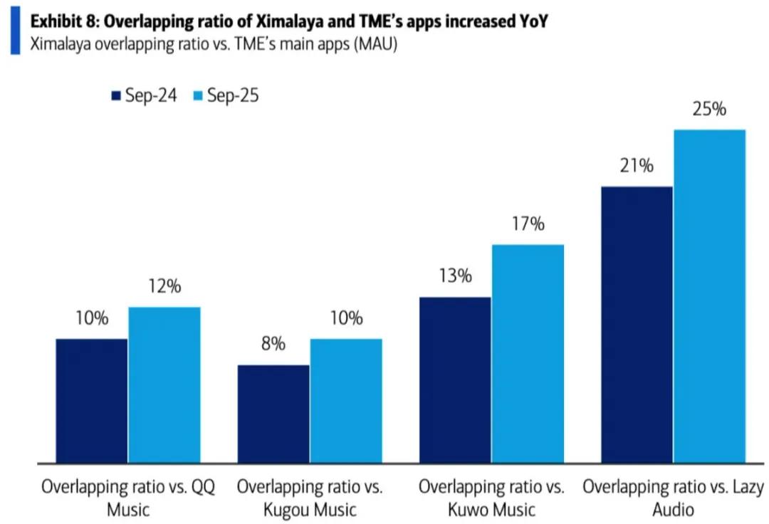 另一方面则是期待喜马拉雅合并后,带来的新增用户。毕竟两个平台核心用户重合度只有10%-15%,但音乐作为普适需求,若以捆绑包形式销售(比如现有会员搭售1-2元溢价),用户的付费转化并不难。