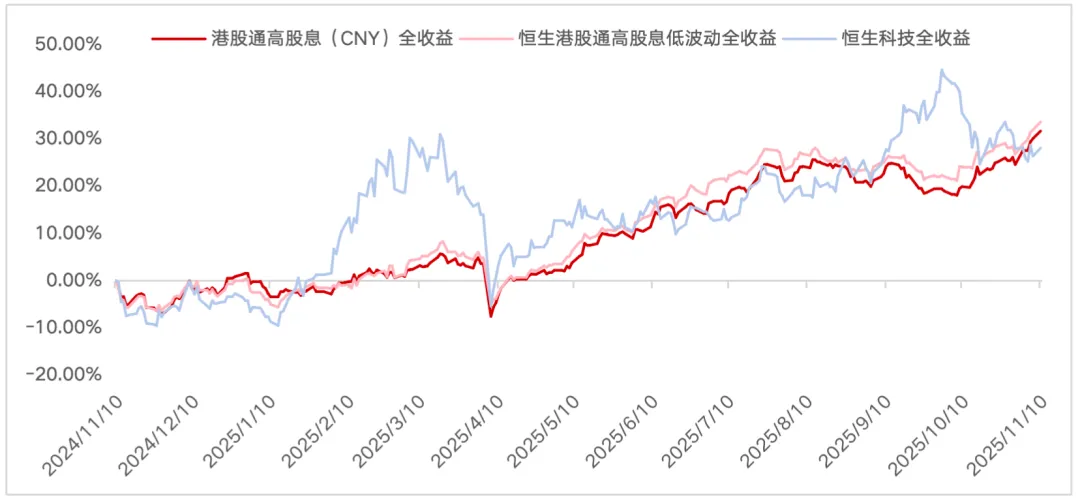 以常用的港股通高股息(CNY)、恒生港股通高股息低波动两大港股红利类指数为例,二者计入样本分红再投资收益的全收益指数截至2025年11月10日收盘,均已攀升至各自发布以来的历史最高位,近一年累计上涨31.65%、33.57%。这个表现,甚至跑赢了恒生科技全收益指数28.02%的同期涨幅。