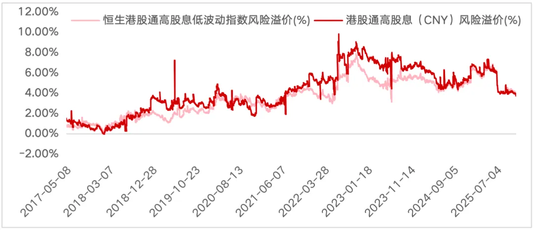 数据来源:Wind,截至2017/5/8-2025/11/10。恒生港股通高股息低波动指数发布日为2017/5/8。风险溢价指标计算方式为:标的指数股息率-10年国债收益率。投资国债和投资股票型基金的风险收益特征不同,投资者进行投资时应当全面考虑投资风险。