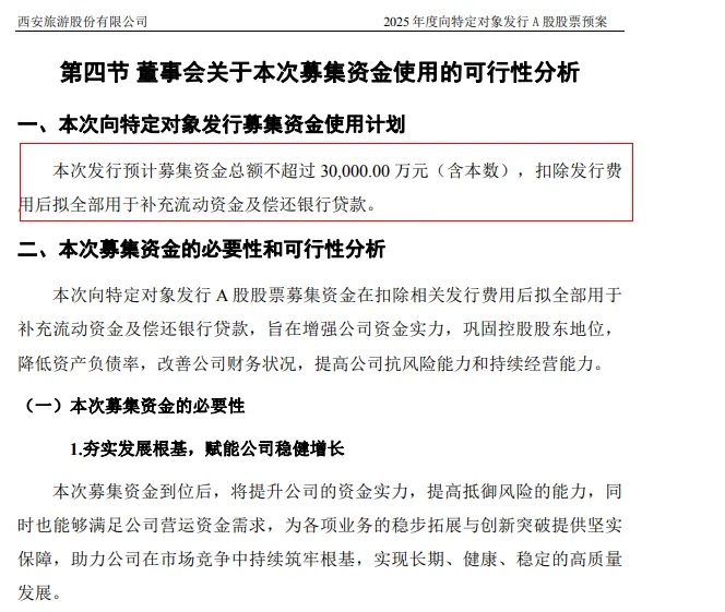 但是,直到今年11月,这个定增一直没有落地。无奈,西安旅游选择终止,并旋即又推出新的定增方案,募资不超3亿元,全部用于补充流动资金及偿还银行贷款。