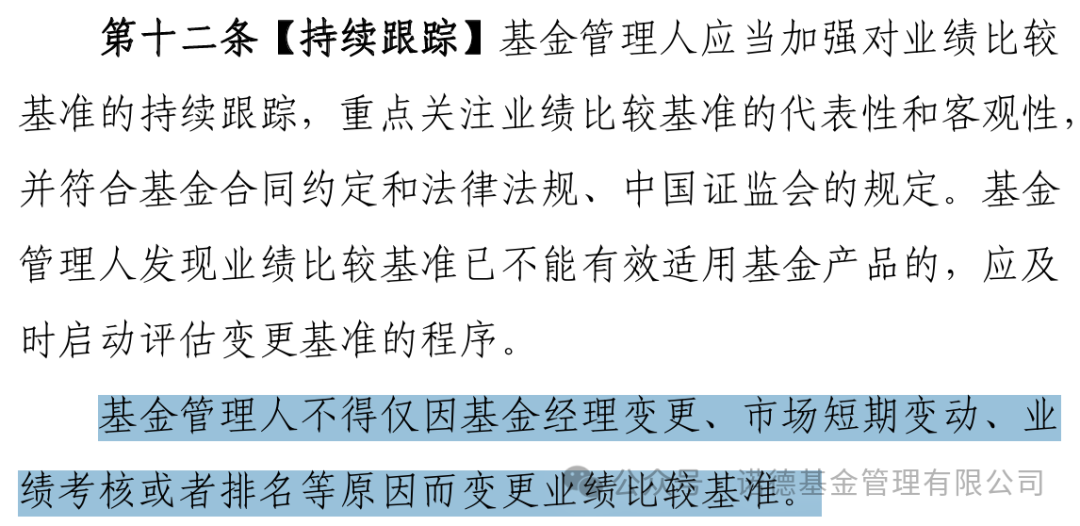 此外,为防止基金管理人通过频繁变更基准来掩盖投资失误,《指引》明确禁止仅因基金经理变更、市场短期变动、业绩考核或排名等原因变更基准。业绩基准确需变更的,必须履行相应的程序和披露义务。