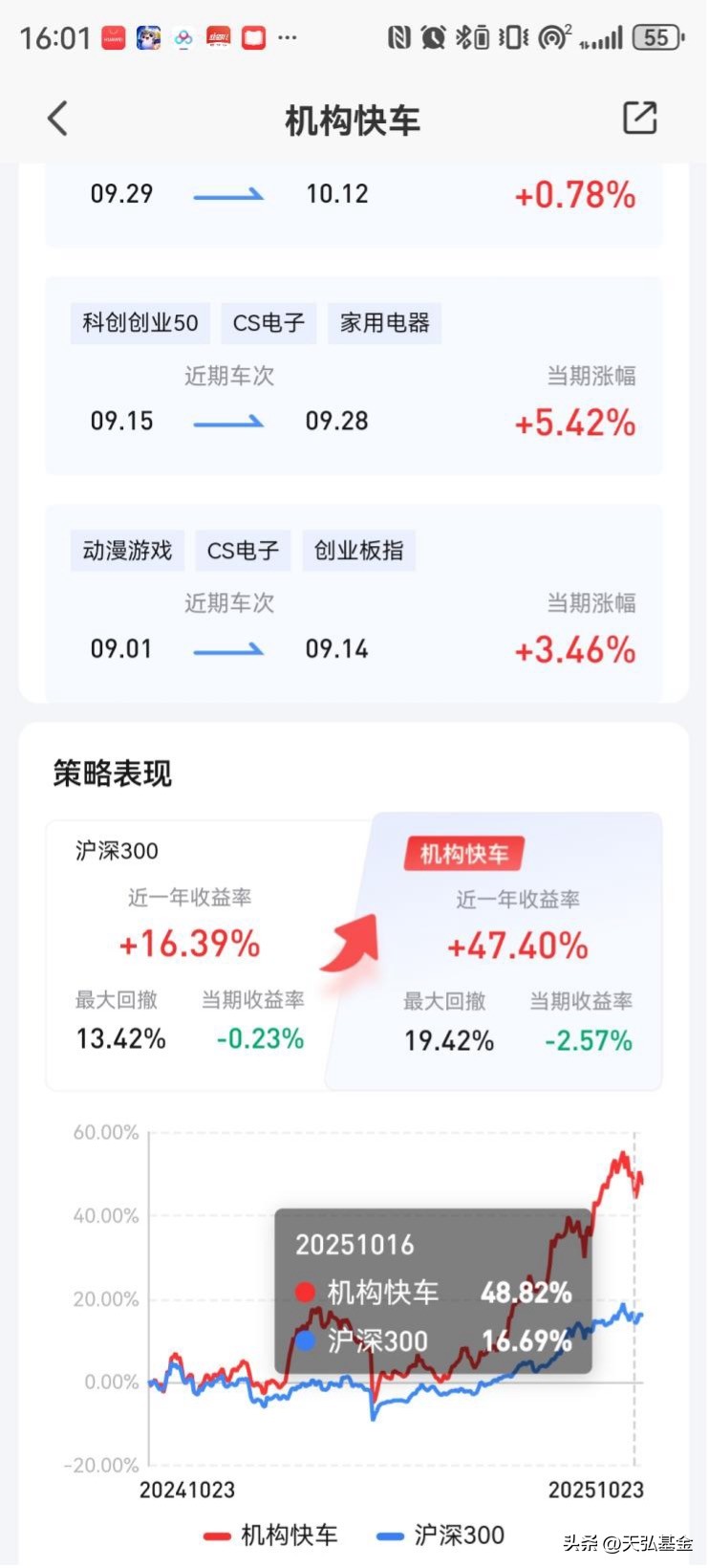 一款投资工具的价值,需理性看待其表现。据实盘数据显示,“机构快车”背后的轮动策略在2024年10月17日-2025年10月23日的回测中,呈现出了不错的表现:近一年收益率达47.40%,同期沪深300指数收益率为16.39%;最大回撤为19.42%,沪深300最大回撤为13.42%。
