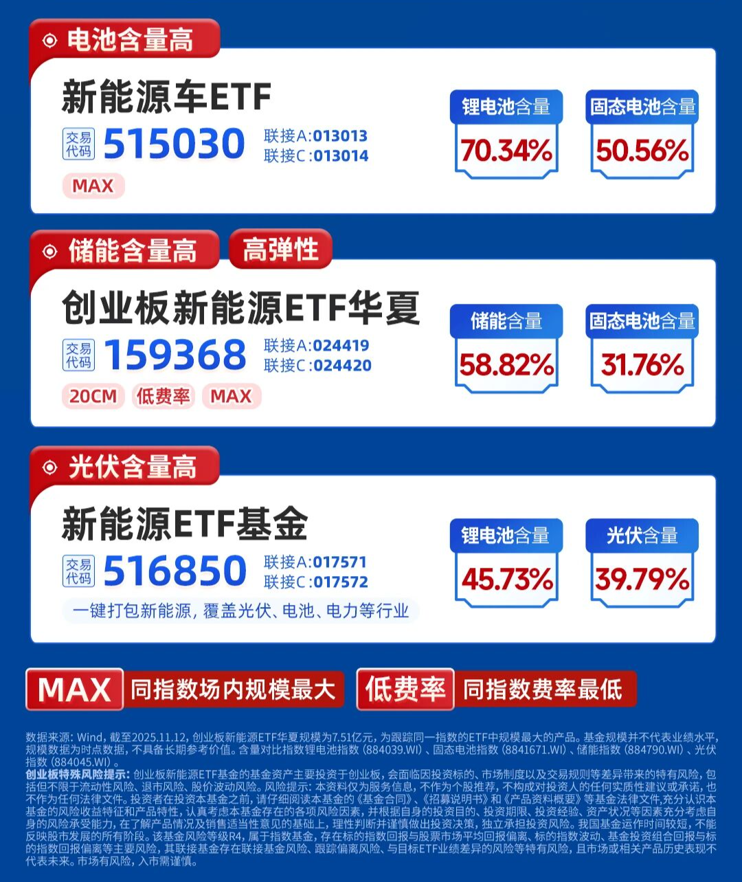 风险提示:本资料仅为服务信息,不作为个股推荐,不构成对于投资者的实质性建议或承诺,也不作为任何法律文件。1.以上ETF及其对应的联接基金为股票基金,主要投资于标的指数成份股及备选成份股,其预期风险和预期收益高于混合基金、债券基金与货币市场基金,属于中高风险(R4)品种,具体风险评级结果以基金管理人和销售机构提供的评级结果为准。2.ETF基金存在标的指数回报与股票市场平均回报偏离、标的指数波动、基金投资组合回报与标的指数回报偏离等主要风险。联接基金存在跟踪偏离风险、与目标ETF业绩差异的风险等特有风险,且市场或相关产品历史表现不代表未来。3.投资者在投资基金之前,请仔细阅读基金的《基金合同》、《招募说明书》和《产品资料概要》等基金法律文件,充分认识基金的风险收益特征和产品特性,并根据自身的投资目的、投资期限、投资经验、资产状况等因素充分考虑自身的风险承受能力,在了解产品情况及销售适当性意见的基础上,理性判断并谨慎做出投资决策,独立承担投资风险。4. 创业板特别风险提示:创业板新能源ETF华夏及对应的联接基金的基金资产可投资于创业板,会面临因投资标的、市场制度以及交易规则等差异带来的特有风险,包括但不限于如下特殊风险:流动性风险、退市风险、股价波动风险。5.基金管理人不保证基金一定盈利,也不保证最低收益。基金的过往业绩及其净值高低并不预示其未来业绩表现,基金管理人管理的其他基金的业绩并不构成对基金业绩表现的保证。6.基金管理人提醒投资者基金投资的“买者自负”原则,在投资者做出投资决策后,基金运营状况、基金份额上市交易价格波动与基金净值变化引致的投资风险,由投资者自行负责。7.中国证监会对基金的注册,并不表明其对基金的投资价值、市场前景和收益作出实质性判断或保证,也不表明投资于基金没有风险。8.产品由华夏基金发行与管理,代销机构不承担产品的投资、兑付和风险管理责任。9.市场有风险,投资需谨慎。