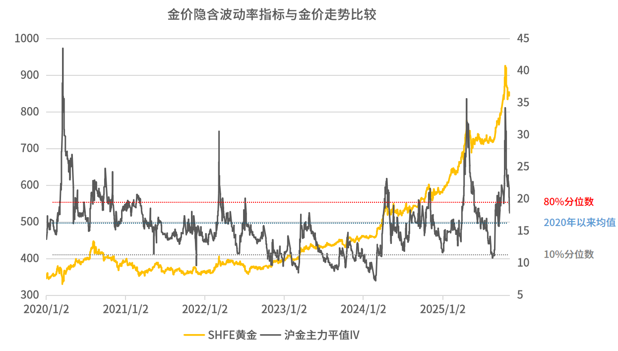 何喆:从历史经验来看,黄金价格的隐含波动率与短期金价表现往往有着较强的相关性。这里我们可以参考沪金主力平价值IV指标与沪金是价格走势之间的关系,其中的沪金主力平价值IV指标背后的含义是黄金期权的隐含波动率水平,可以作为市场交易拥挤程度的参考指标之一。