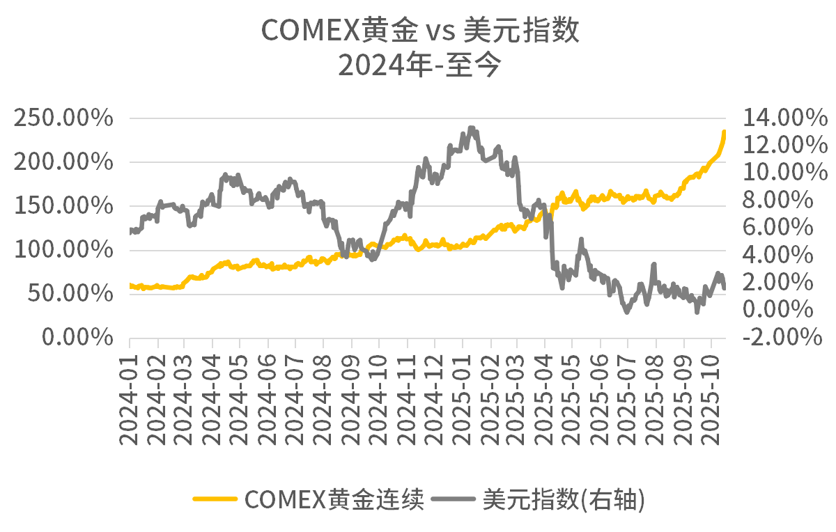 例如以下图为例我们可以看到,在2019年-2023年,COMEX金价与美元指数还有比较强的负相关性。但是从2024年起至今,黄金价格几乎走出了一条单边上行的走势,美元指数的波动不再是影响金价的主要因素。