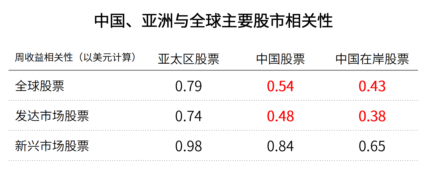 资料来源:彭博、摩根大通、美银美林、汇丰投资管理;截至2025年9月15日五年期间的周收益相关性。亚太区股票(MSCI亚太所有国家净总收益指数,美元);中国股票(MSCI中国每日净总收益指数);中国在岸股票(沪深300指数,美元)。全球股票(MSCI全球所有国家净收益指数,美元);发达市场股票(MSCI全球净收益指数,美元);新兴市场股票(MSCI新兴市场净收益指数,美元)。 投资的价值以及投资的任何收益可能上升也可能下降,投资者可能无法收回投资本金。过往表现不代表未来收益。指数收益假设将所有分配再投资,且未反映任何费用或支出。无法直接投资于指数。提供的信息仅供演示之用。