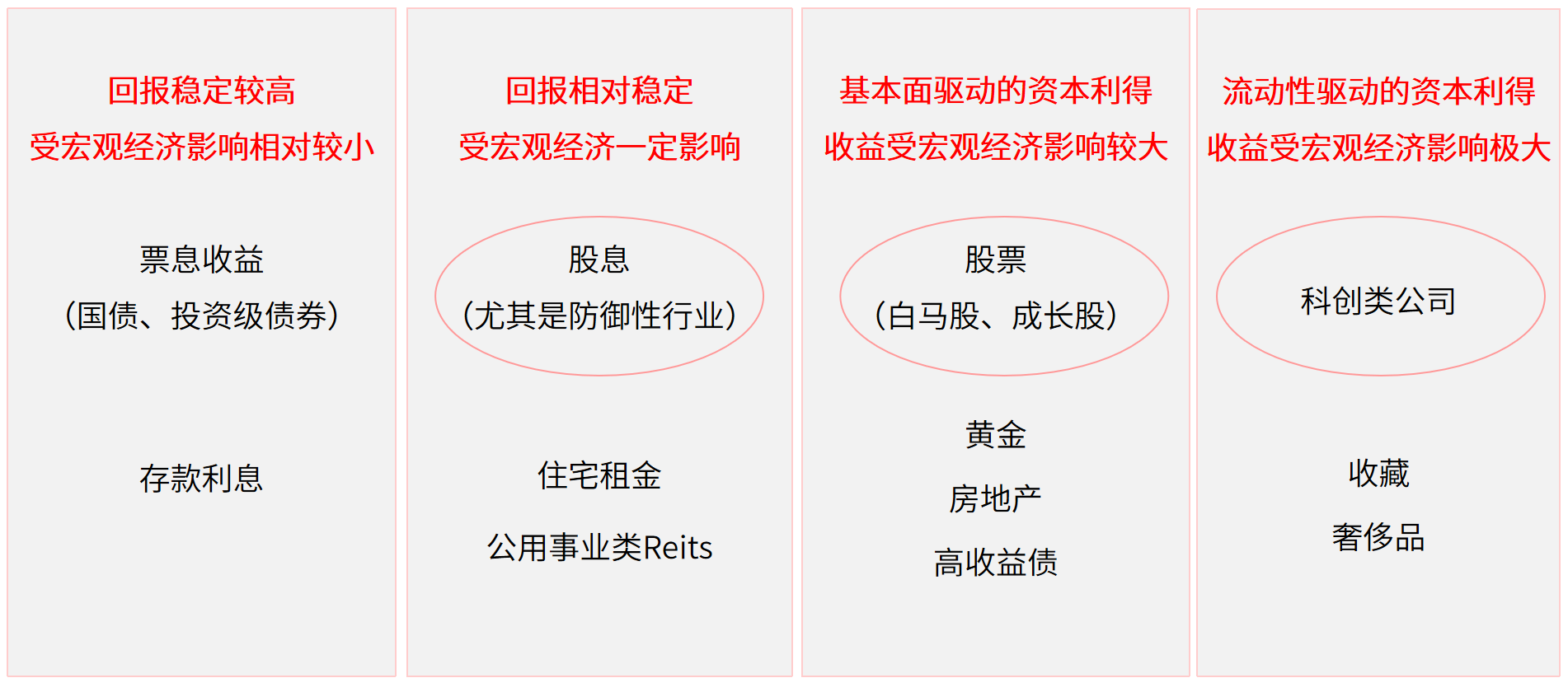 不同的大类资产,或者某种大类资产中不同的类别,往往具有截然不同的底层收益来源,包括:股票的收益来源有股息、债券的收益来源有票息、赚取买卖价差所得的资本利得等。