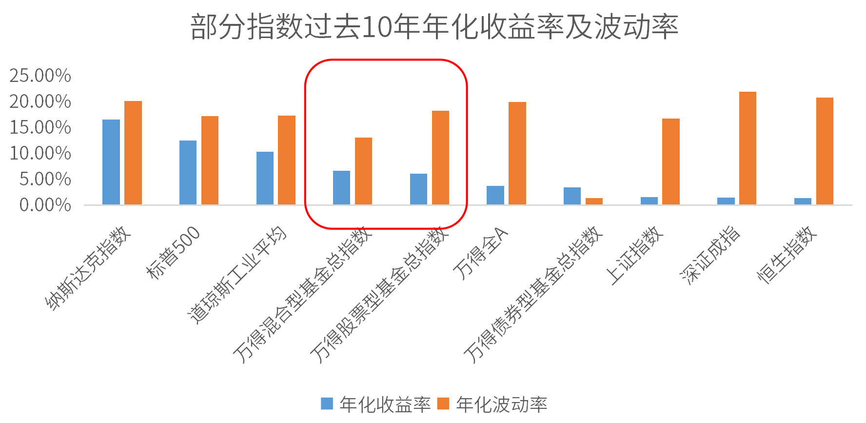 但是通过简单的股债混合,我们可以有效降低波动率。例如我们看到万得混合基金指数,对比万得股票型基金指数,虽然收益率水平相似,但是混合型基金指数波动率明显降低。