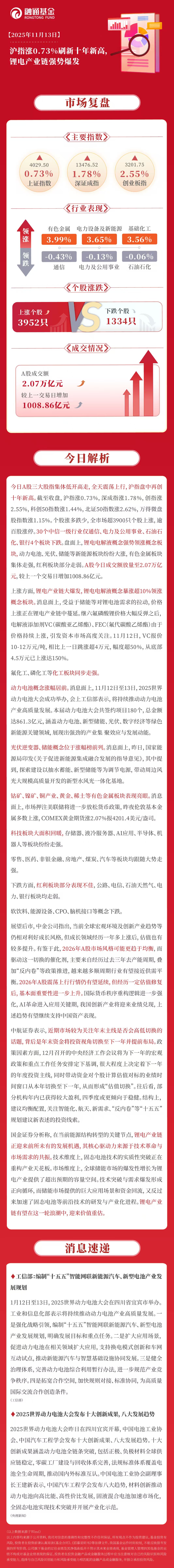 今日A股三大股指集体低开高走,全天震荡上行,沪指盘中再创十年新高。截至收盘,沪指涨0.73%,深成指涨1.78%,创指涨2.55%,科创50指数涨1.44%,北证50指数涨2.62%,万得微盘股指数涨1.15%。个股涨多跌少,全市场超3900只个股上涨,逾百股涨停。