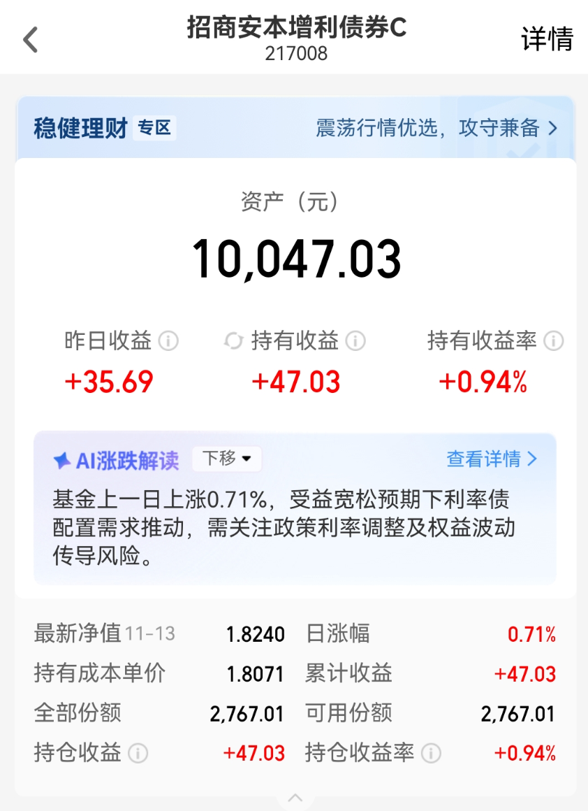 近一周来,股债两市都比较震荡,而招商安本增利债券C依然收红!持仓收益近1%,稳定相当高~