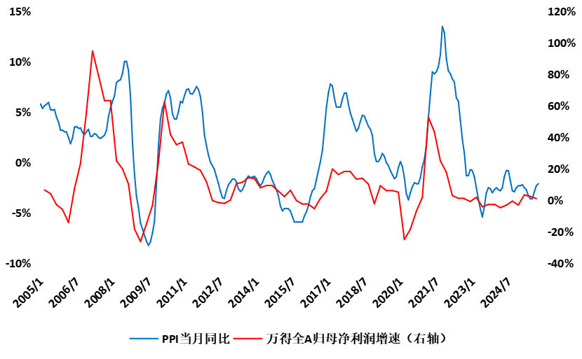 以PPI衡量的中国库存周期影响了上市企业利润变化,2025年全A归母净利润已然转正