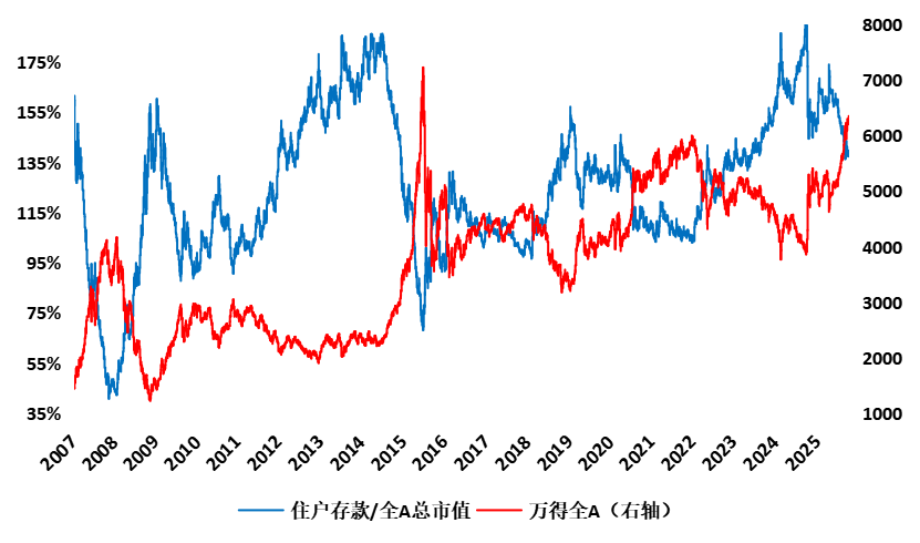 住户存款与A股总市值之比存在显著的上下限,且与全A点位呈现反比