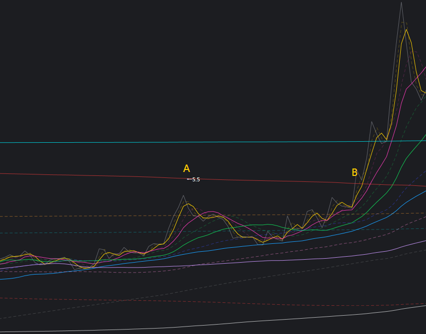 $亚太药业(SZ002370)$11月5日即发帖预报“第四阶段顶约9.4元,目前最高9.31元”,后于11月12日再次发帖“阶段顶约9.4元,目前已在该区域位置,且上方有大周期阻力位,直接突破概率不高”。下图1中B点为现价位置,正抵在上方阻力位,下图2中A点为2022年1月17日抵在上方阻力位。单纯从价格看,这两个高点价格接近(约10元),实则毫无关联,因为阻力位来自完全不同的周期(图中不同颜色表示不同周期位)。
