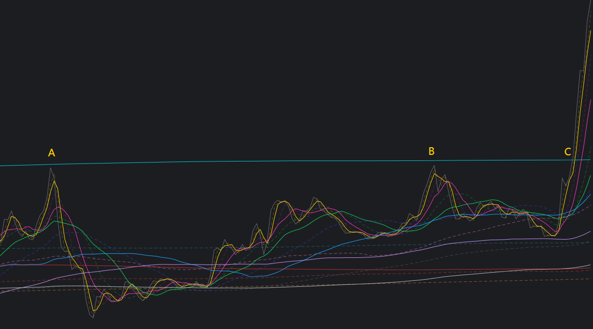 $神州信息(SZ000555)$11月5日早盘预报第二级阶段顶22.6元,目前已初步验证。下图中A点(3月21日)和B点(8月27日)高度接近,正抵在上方阻力位(注:图中线条不是手工画线,全部是系统数据自动生成),如果在这两点附近买入,会完美实现一买就跌。而这两个位置之所以不能突破,从动力角度看是因为多头动力没有强大合力,到了阻力位附近多头已经衰竭,而C点位置在前期回撤后,于下方多头阻力再次形成合力,一举突破(概率超80%)。
