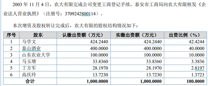 在2003年底,山东农业大学也是农大科技的股东、持股比例为10%;后于2016年5月,山东农业大学将所持股份转让给了马学文,并退出了农大科技的股东名册。但农大科技公司名称的“农大”字样却保留了下来,同时这也让现任山东农业大教师的郑军先生,有资格担任农大科技的独立董事。