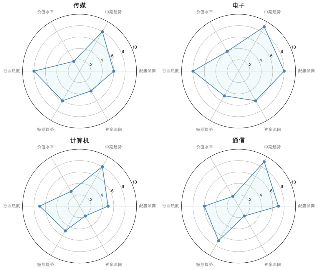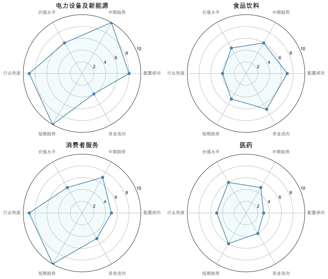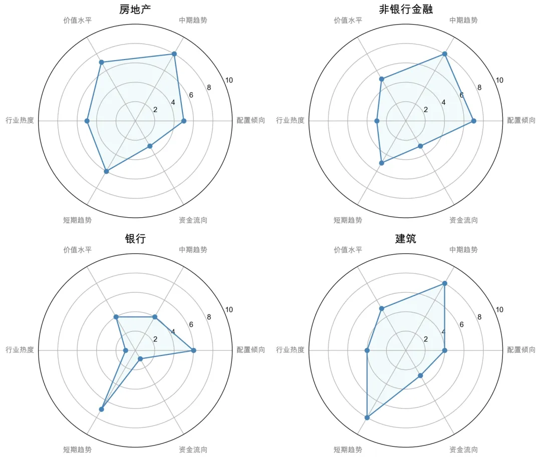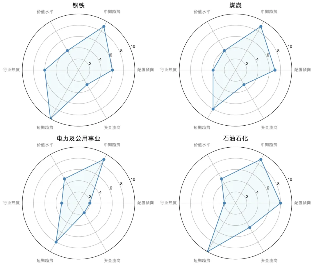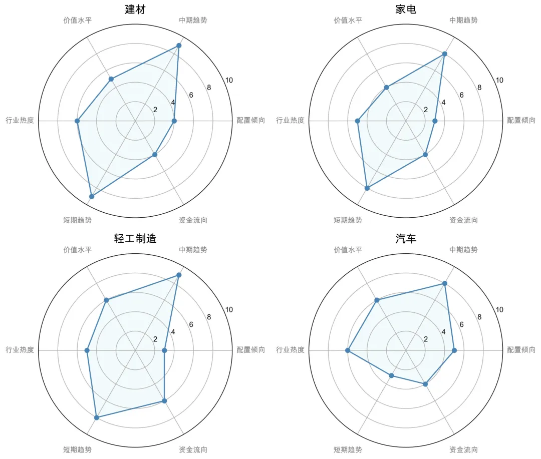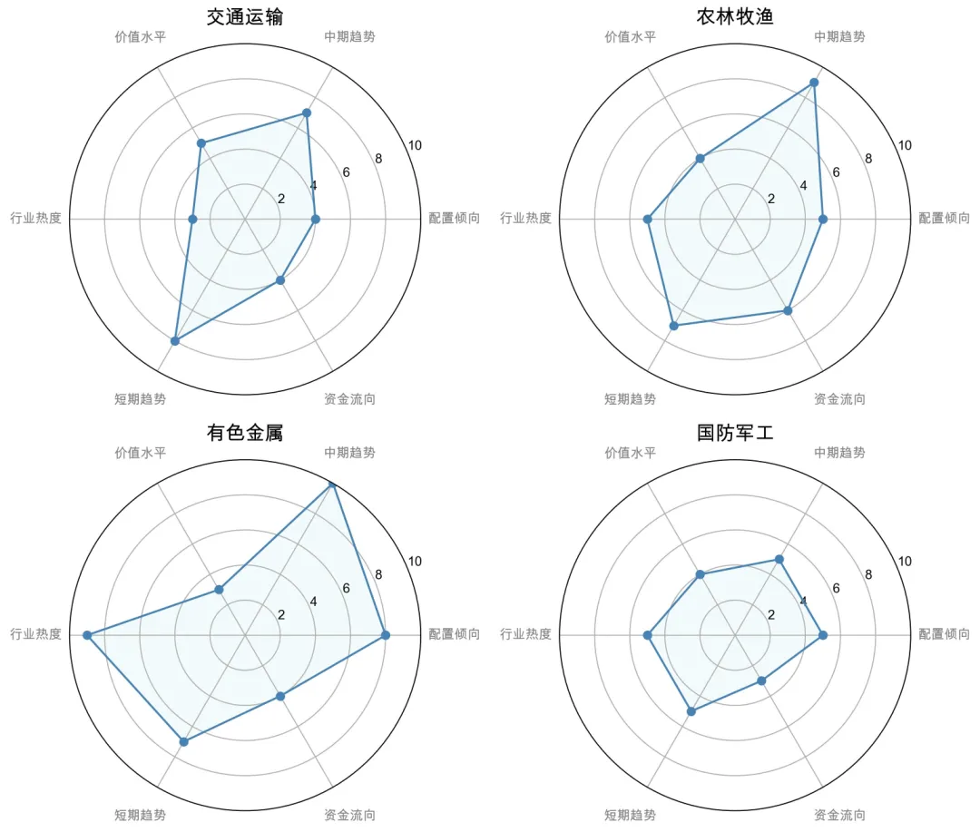 依据中信一级行业分类,对每个行业有配置倾向、资金流向、价值水平、行业热度、中期趋势、短期趋势6项评分,每项满分10分。