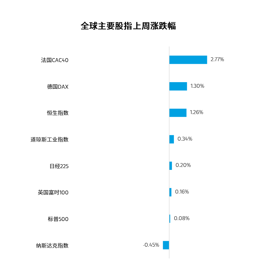 上周全球主要股指表现整体趋稳。美股方面,道琼斯工业指数上涨0.34%,纳斯达克指数下跌0.45%,标普500指数上涨0.08%。