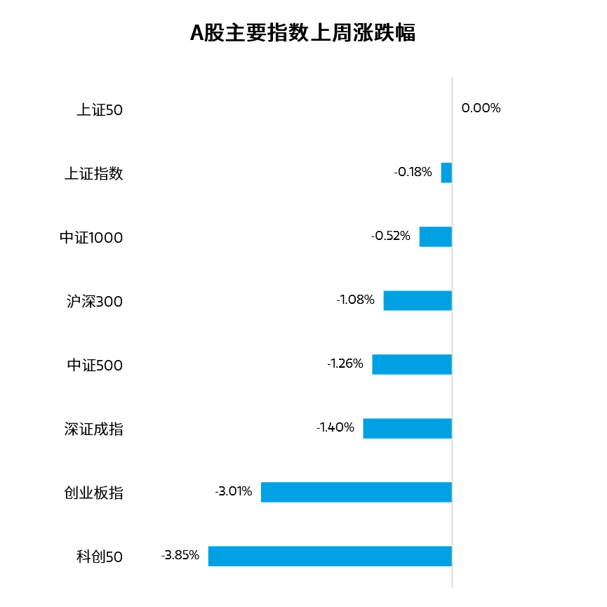 上周A股三大指数集体走弱。截至上周五收盘,上证指数全周下跌0.18%,深证成指下跌1.40%,创业板指下跌3.01%。从上周表现来看,受科技股持续回调影响,即便新能源和贵金属板块上行依然未能提振做多情绪,沪指受到拖累,未能守住4000点大关。