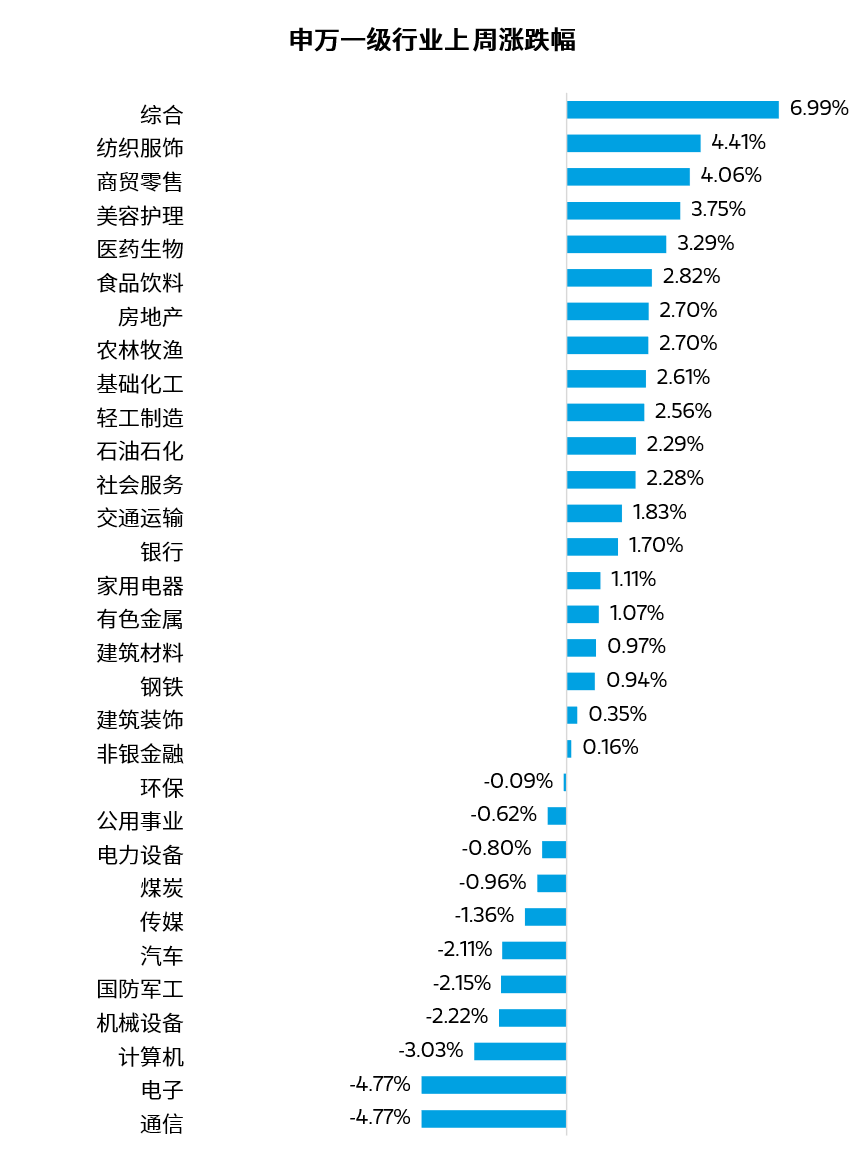 行业表现方面,申万一级行业指数中,综合、纺织服饰、商贸零售等板块表现较好,通信、电子、计算机等板块表现较差。