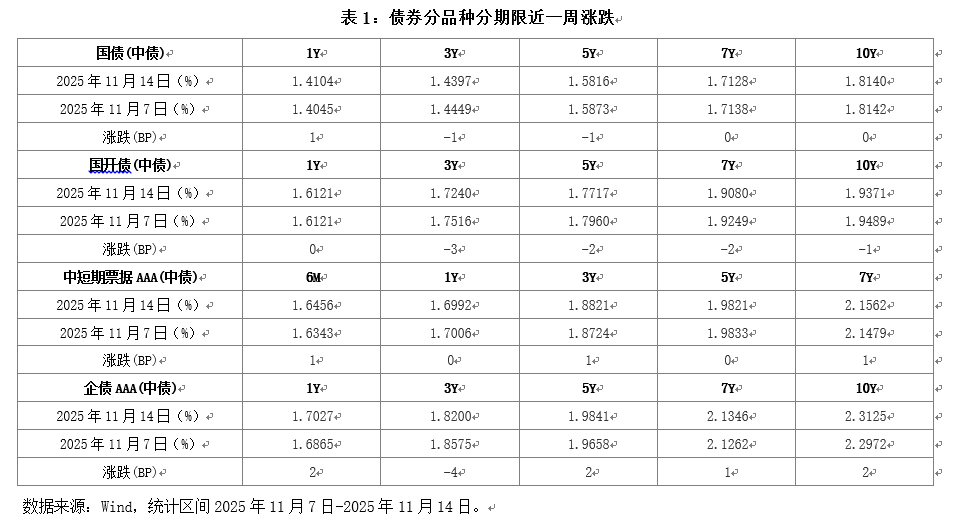 利率方面,截至11月14日,1Y、3Y、5Y、7Y、10Y、30Y国债收益率较前周收盘分别变动+0.59BP、-0.52BP、-0.57BP、-0.10BP、-0.02BP、-1.00BP至1.4104%、1.4397%、1.5816%、1.7128%、1.8140%、2.1481%。