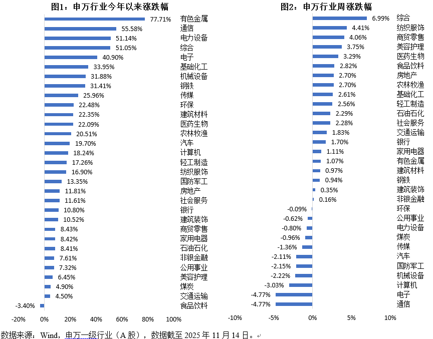 上周A股市场整体调整,上证综指报3990.49,下跌0.18%;深证成指报13216.03,下跌1.40%;创业板指报3111.51,下跌3.01%。上周海外扰动因素较多,宏观上美国政府关门导致经济数据缺失,市场对美联储12月降息预期降温;产业上AI泡沫叙事进一步发酵,对人工智能投资与回报不匹配的担忧加剧。全球风偏显著降低,各主要市场股指均出现较大幅度回撤,拖累A股市场表现。行业表现上“高切低”延续,受10月通胀超预期回暖影响,纺服、零售、食饮等低位消费板块,以及有色、小金属、化工等反内卷资源品方向涨幅居前。成长风格整体偏弱,TMT受全球AI板块下跌拖累表现靠后,锂电受上游价格上涨催化表现较优,低位医药板块也出现反弹。受市场风偏回落影响,银行等稳定红利板块继续上涨。申万一级行业今年以来和近一周涨跌幅详见附图1和图2。
