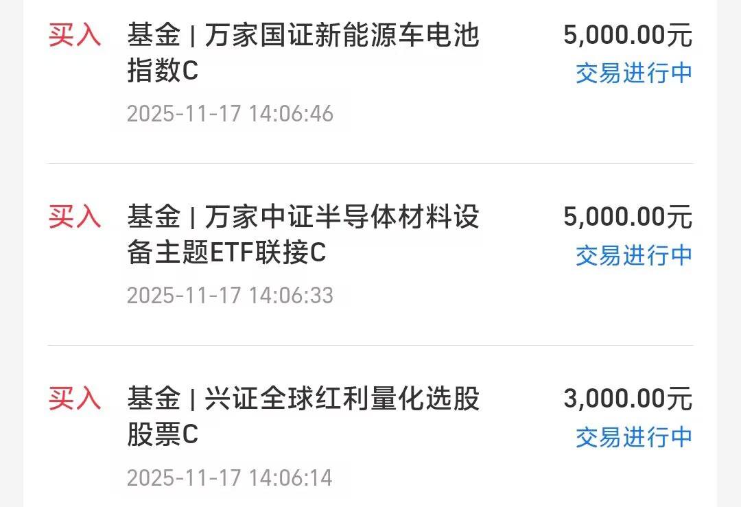 $万家国证新能源车电池指数C$,+5000元。这只是新能源车电池指数,持仓更侧重新能源车的上下游电池链,除了固态电池外,上游锂矿和电池材料等含量更高,上周的表现会更好。考虑到上游材料涨价,下游固态电池量产提前和储能等需求超预期,接下来电池有望接替并成为市场新的主线。我计划继续布局万家国证新能源车电池,跟上电池的下一波趋势。