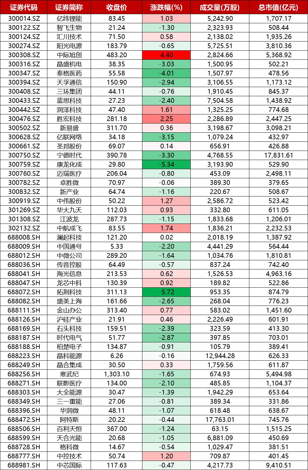 今日成分股中际旭创、胜宏科技涨幅居前。