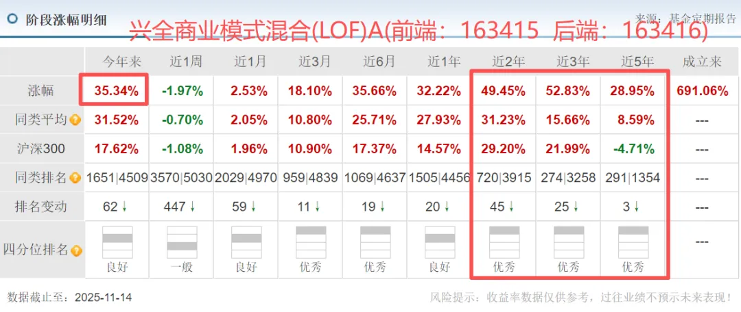 兴全商业模式LOF,上任时间2018年7月10日,截至2025年9月30日,基金公司持有该基金金额达到了6537万元;截至2025年11月14日,该基金今年上涨35.34%,近2年涨幅49.45%,近3年涨幅52.83%,近5年涨幅28.95%,近2年、近3年、近5年的四分位排名均是优秀。