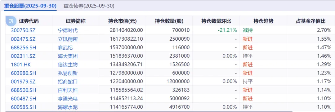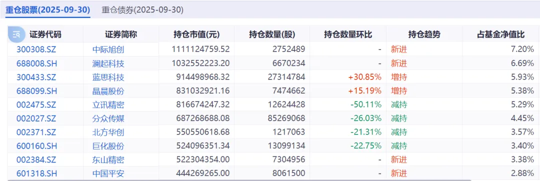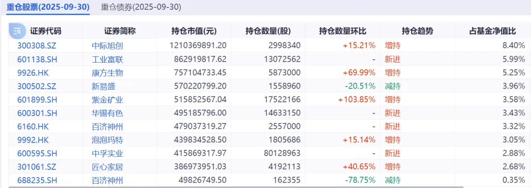 数据来源:iFinD,截至2025年9月30日,重仓股展示不构成投资建议
